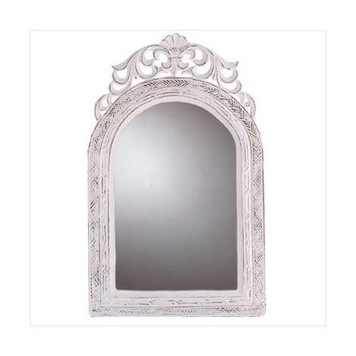 Wood-framed vintage-look mirror adds French country flair to your "chateau!" Weathered white finish is a fabulous fit for any color scheme. 12 1/2" x 1/2" x 20" high.